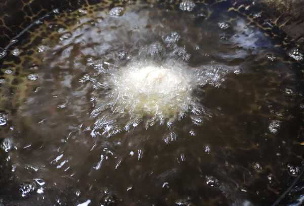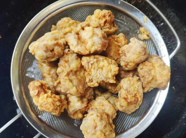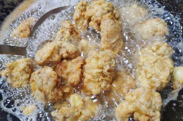 6,依次把剩下的雞塊放入油鍋,繼續小火慢炸至金黃,期間需要把雞塊小心翻動數次: