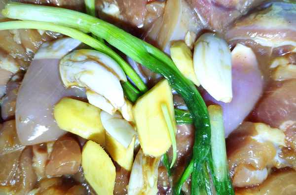 1,雞腿肉去骨去肥肉,切塊。加入料酒、薑片、蒜米、蔥段、檸檬片,再加入適量鹽、糖、醬油、胡椒粉,用手抓揉按摩兩分鐘,醃制半小時以上更入味。