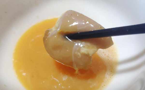 3,開好油鍋,油溫控制在120-150度之間,然後調小火。筷子夾住雞塊在蛋液裡面滾一圈: