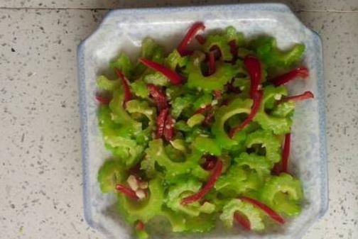 涼拌苦瓜的制作方法,將苦瓜洗凈,從中間打開,用小勺去除籽。然後頂刀切成小薄片,紅椒切成絲。鍋內加1000克清水,大火燒開,放入切好的苦瓜,紅椒段,焯40秒,撈出過涼水備用。將焯好的苦瓜、紅椒段放入器皿中,加入鹽10克,味精5克,白糖10克,香油5克,拌勻裝盤即可。清淡去火,非常好吃。