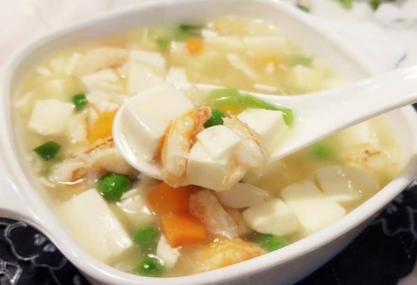 蟹肉豆腐羹做法,冷凍蟹肉解凍,用水沖一遍,擠幹水份,用料酒拌一下,去腥,嫩豆腐切小丁。熱油鍋,把蔥白爆香,蟹肉放入炒一下。倒入500ml水煮開,放入豆腐,青豆仁胡蘿卜粒煮約2分鐘,放鹽和雞粉調味。慢慢倒入生粉水勾芡,即可。鮮美滑嫩。吃的時候撒入白胡椒粉,添加風味的同時,又暖胃。