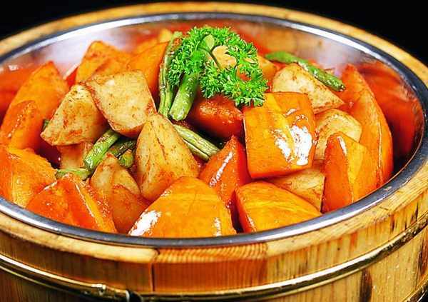 CXC02035紅薯南瓜燜豆角,將紅薯南瓜切滾刀塊,豆角摘洗幹凈備用。熱鍋涼油,放薑末爆香,再下肉糜炒散,等肉糜變白後淋些生抽上色。下蔥蒜末炒勻;再下豆角翻炒至稍微變色,這是再放入南瓜塊。等南瓜軟爛後,加鹽、糖等調味,再大火收下汁兒就ok啦!細細地品味這道美食真是堪稱人間美味!