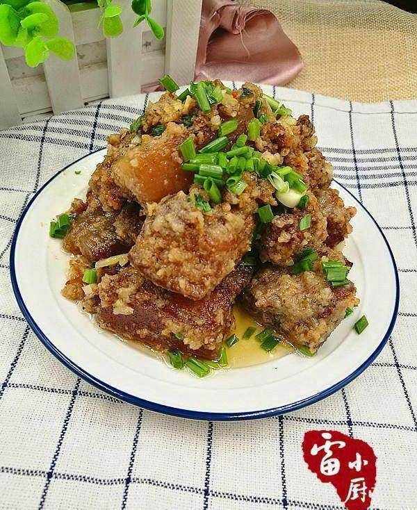 2、熱鍋下油,加入小蔥頭爆香,再加入粉蒸肉,蔥花拌勻出鍋。
