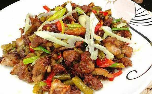 4、鴨肉翻炒好之後,加入酸豆角、紅椒一起翻炒一會,加入大蔥,蔥花出鍋。