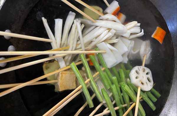 步驟7、將焯好的串放入之前調制好的湯底中,浸泡一會就可以吃瞭。