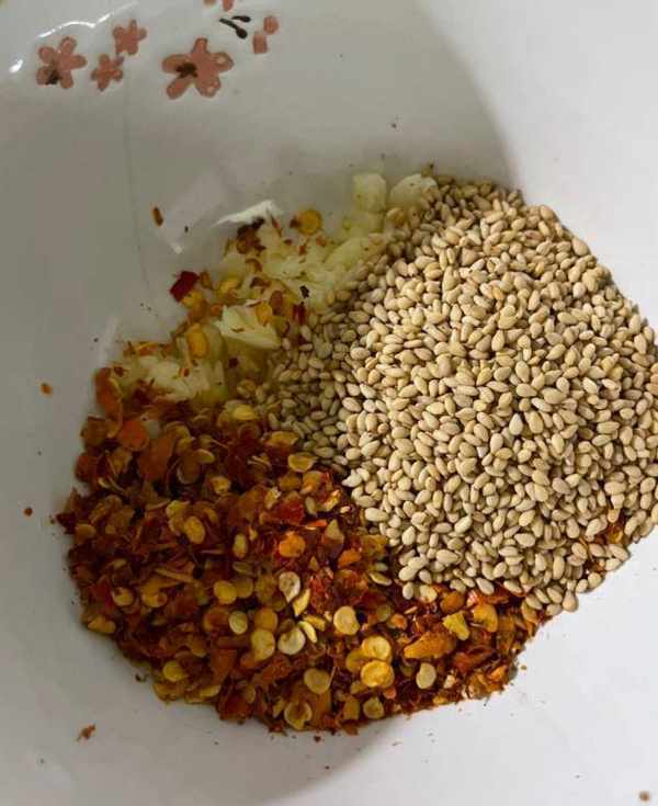 步驟2、調制底料,先用一個空碗,裝一些芝麻、辣椒和蒜末混合。