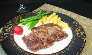 將蔬菜擺盤,牛排放入盤中靜止3分鐘封汁後食用。大師秘籍:1、牛排的熟度根據自傢鍋灶的火力掌握,但開始要大火煎制,這樣肉汁不會流失。2、煎好的牛排靜止一會很重要,因為剛出鍋的牛排纖維仍在餘溫下收縮擠出肉汁,這時切開會流失肉汁。封汁後纖維開始放松,肉汁留在牛排內。