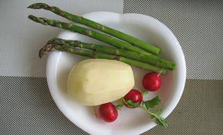 用料:主料:牛排2塊,蘆筍適量,土豆1個,蘿卜葉適量.輔料:食鹽適量,黑胡椒適量,橄欖油適量.