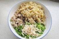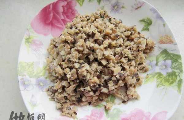 9.把香菇末蝦皮雞蛋塊加鹽味極鮮五香粉一起拌均勻,加熟花生油香蔥末一起拌拌