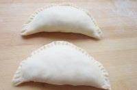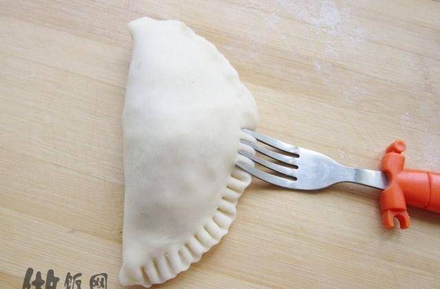12.加香菇餡,包成大餃子形狀,用叉子壓出花邊