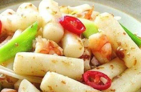 材料:年糕200克,鮮蝦100克,綠豆芽25克、薑2片,生抽1湯匙,胡椒粉少許,食鹽適量