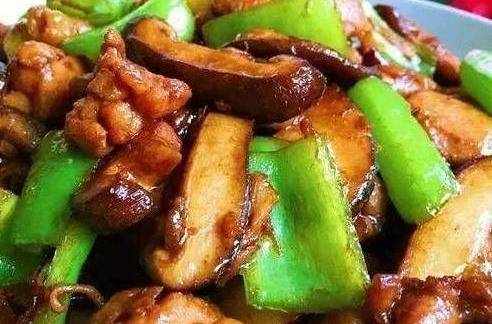 5、放入雞塊快速翻炒,直至雞塊變色後下入板栗翻炒,待雞塊和板栗均炒熟後下入事先煎好的香菇,調入醬油上色,最後下入青椒翻炒均勻,放入少量雞精即可出鍋
