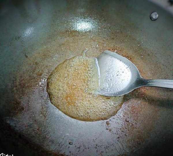 第9步、勺一勺糖漿備用,等一下用來拉絲。