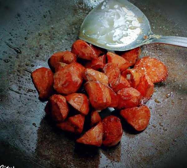 第10步、把地瓜放進去翻炒,動作要快。