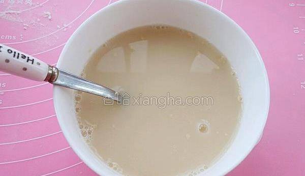 1.把酵母、小蘇打和鹽用溫水攪拌至溶解。