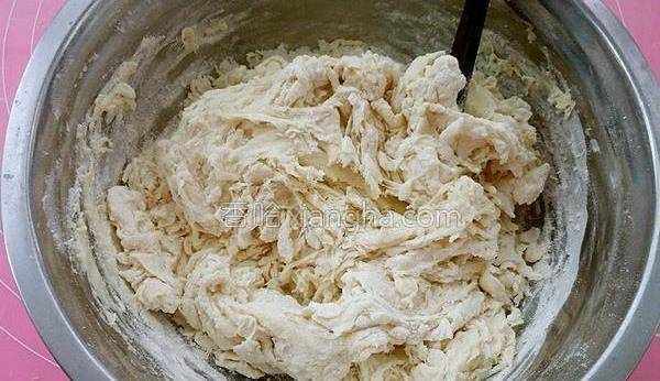 2. 把面粉放入盆中,放入攪拌好的酵母小蘇打水,用筷子攪拌成棉絮狀。