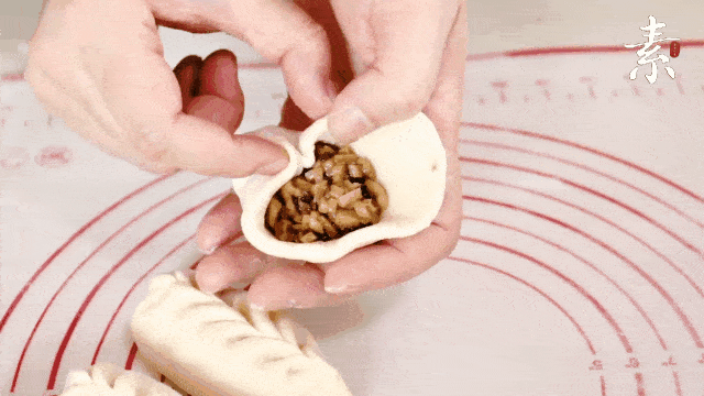 5.放入餡料,先在面皮的一處捏出一個褶子,然後再左右交替捏褶子,直至收口,做成秋葉形生胚。