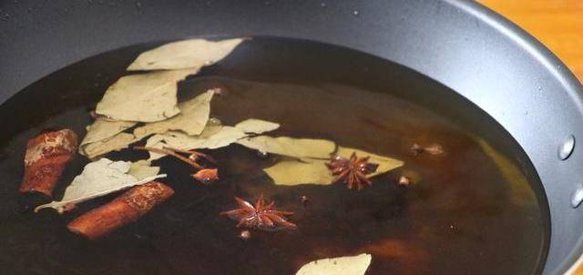 鍋內倒入清水,放入3小勺紅糖,一小勺白糖,3小勺鹽,幾粒丁香,幾片香葉,2顆八角,2根桂皮,大火煮制。