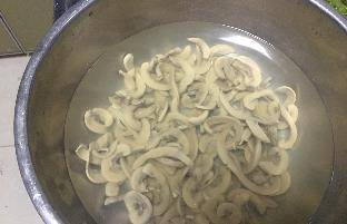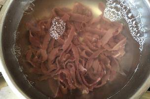鍋中倒水,燒開後,下腰片汆水,完全變色後,立馬撈出過涼水。