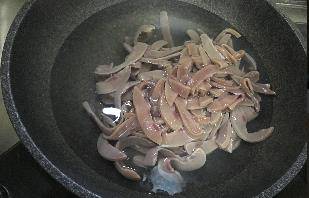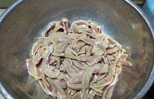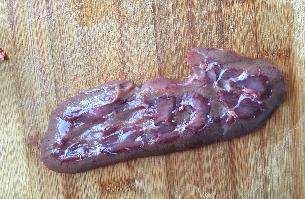 做法:豬腰子撕掉表面白膜,橫向切成兩半,去騷筋,切片。