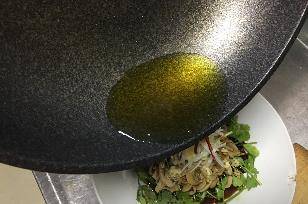 鍋中倒油,燒爆後淋在腰片蔥絲上。