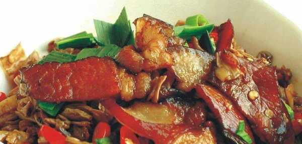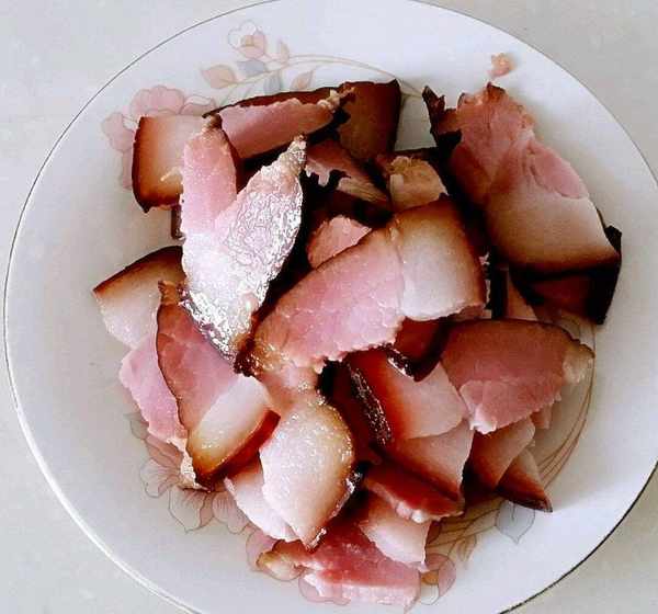 2.、臘肉選用新鮮的帶皮五花肉,分割成塊,用鹽和少量亞硝酸鈉或硝酸鈉、黑胡椒、丁香、香葉、茴香等香料醃漬,再經風幹或熏制而成, 具有開胃祛寒、消食等功效。