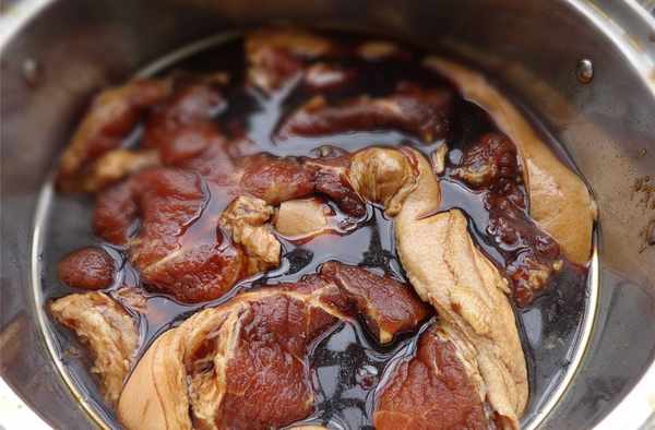 (2)生抽90g,老抽70g,鹽50g,冰糖30g,白酒30g,花椒,八角適量拌勻後倒入五花肉,蓋蓋搖晃拌勻。