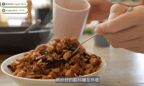 取一杯子,杯子裡塗上少許白麻油,將炒好的餡料鋪至杯底,再將糯米填滿壓緊