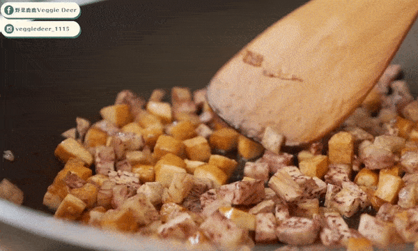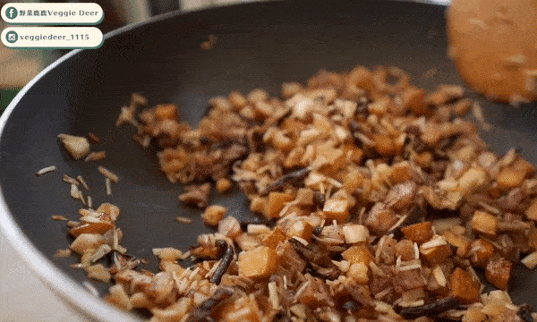 取一炒鍋,倒入適量的白芝麻油,倒入芋頭跟豆幹煸至金黃