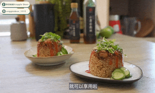 最後淋上甜辣醬,放上素松、香菜以及醃好的小黃瓜