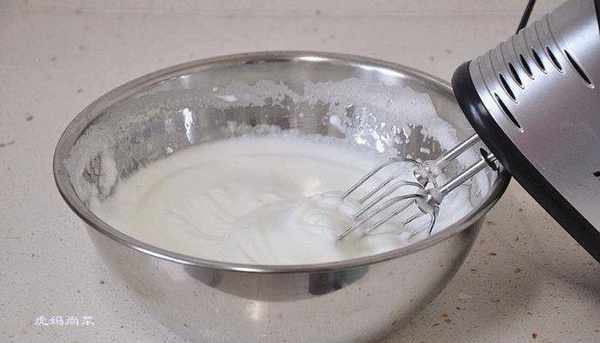 3.蛋白中加入白糖,用電動打蛋器打至粘稠的膏狀時關閉,拉出打蛋器後上面粘著的是不滴落的彎鉤狀即可。或者打成稍硬的濕性泡發也行。