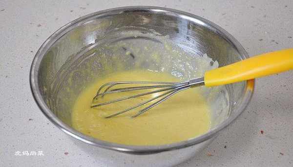 2.蛋黃中加入白糖,攪打至顏色發白;然後加入色拉油拌勻,再加入梨汁拌勻;最後過篩加入低筋面粉拌勻,成粘稠糊狀;靜置待用。