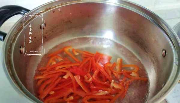 第二步 焯水,鍋中燒水,水開加入紅椒,焯水2分鐘撈出。紅椒焯下水再拌,口感脆甜,非常好吃。