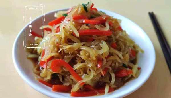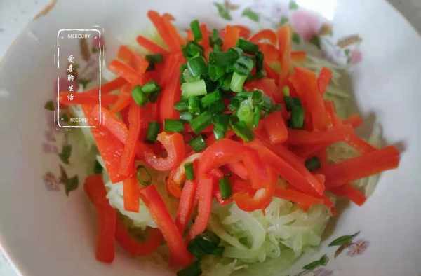 第一步 切絲醃制,萵筍洗凈,去掉外皮,先切薄片,然後再切成絲,放入大碗中,加入少許食鹽,抓拌均勻,靜置一會。紅椒洗凈,對半切開,去蒂去籽,切成細絲,放入另一碗中,蔥花切好備用。