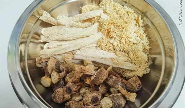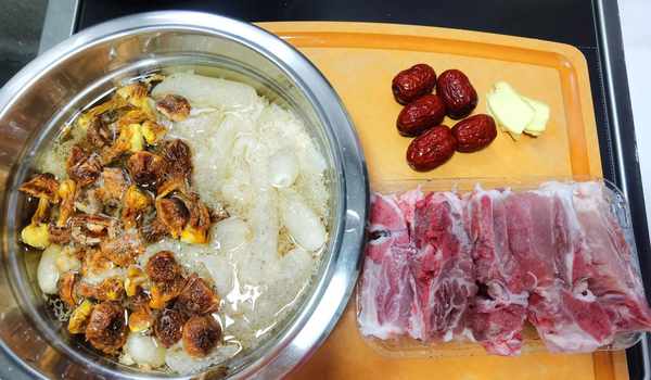 食材準備:姬松茸,竹蓀適量,先用清水浸泡軟,清洗幹凈。排骨頭約一斤左右,紅棗幾個,薑片幾片。