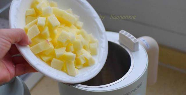 隻使用蘋果的話,湯很薄,連香味都沒有,放一半米的話,米的香味會覆蓋蘋果的香味,當然很好吃,把一半的土豆和蘋果組合起來比較好吃,豐富的土豆淀粉給果汁加濃,口感和味道更美,一起做吧。