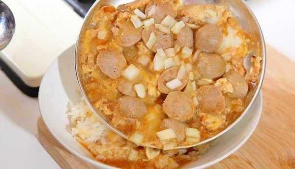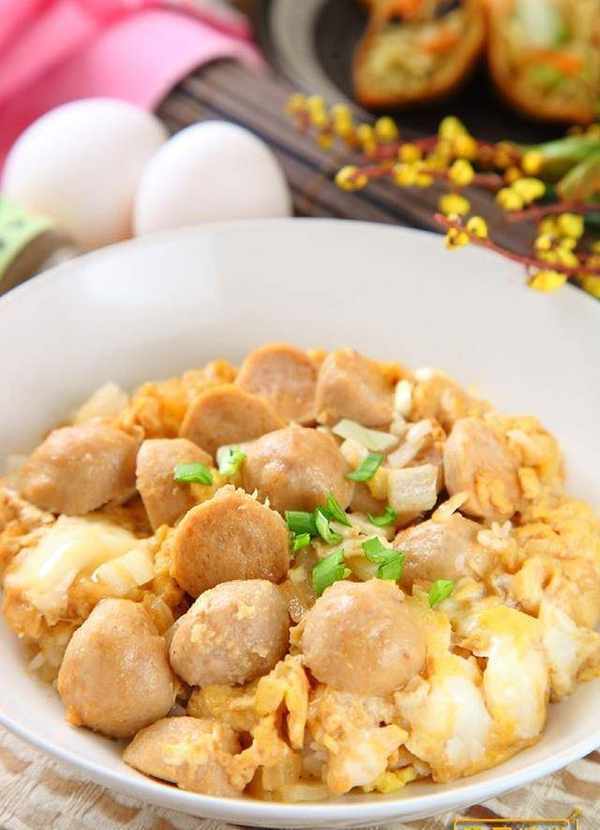 放入切好的小貢丸,並加入蛋液,轉小火、不停攪拌,起鍋前再加上剩下來的新鮮洋蔥丁,借此呈現不同的口感,撒些蔥花裝飾即可倒在飯上。完成。