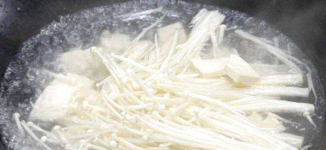 起鍋添入適量清水,下入金針菇和豆腐,用勺子翻動幾下,焯水一分鐘倒出控水。