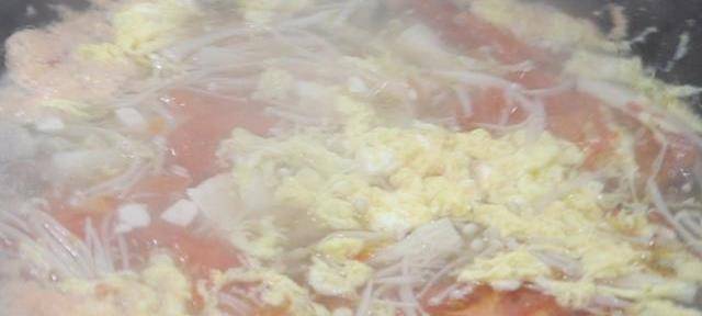 鍋內再添入適量清水,加入食鹽5克,胡椒粉1克,雞粉2克,攪拌化開,等水燒開後,下入火腿腸,煮一分鐘倒入金針菇和豆腐,繼續煮一分鐘,下入西紅柿,淋入雞蛋液,大火煮開。