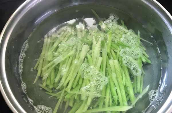 5、鍋中倒入適量水,煮開後把蘿卜絲放入鍋中焯下水後撈出,焯水可以去掉蘿卜味。
