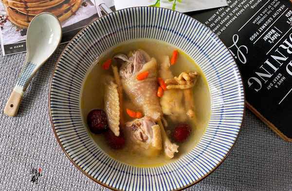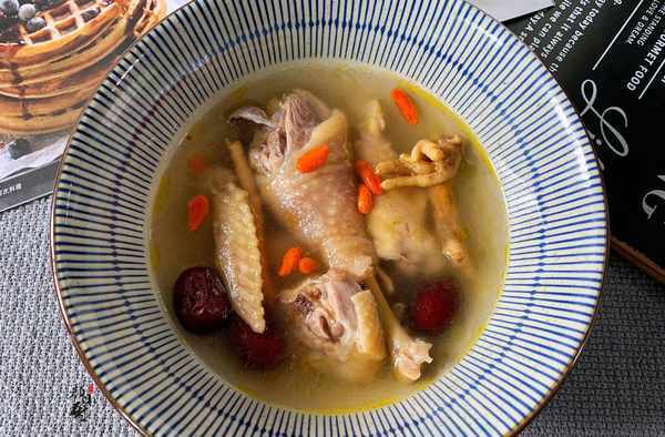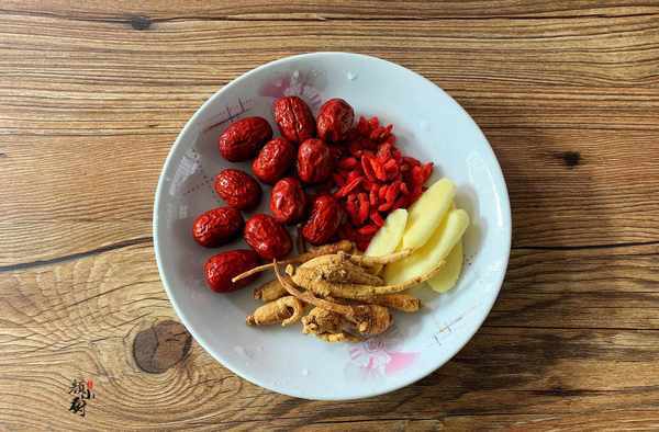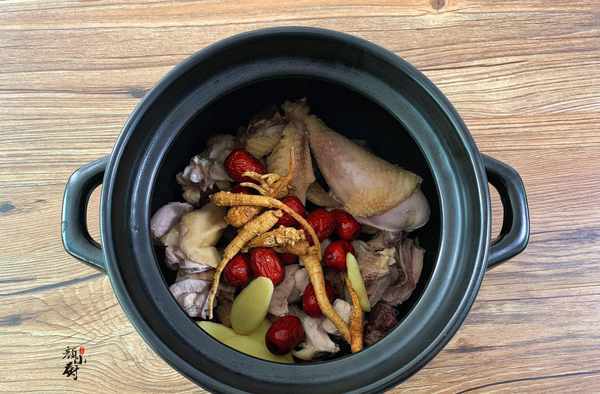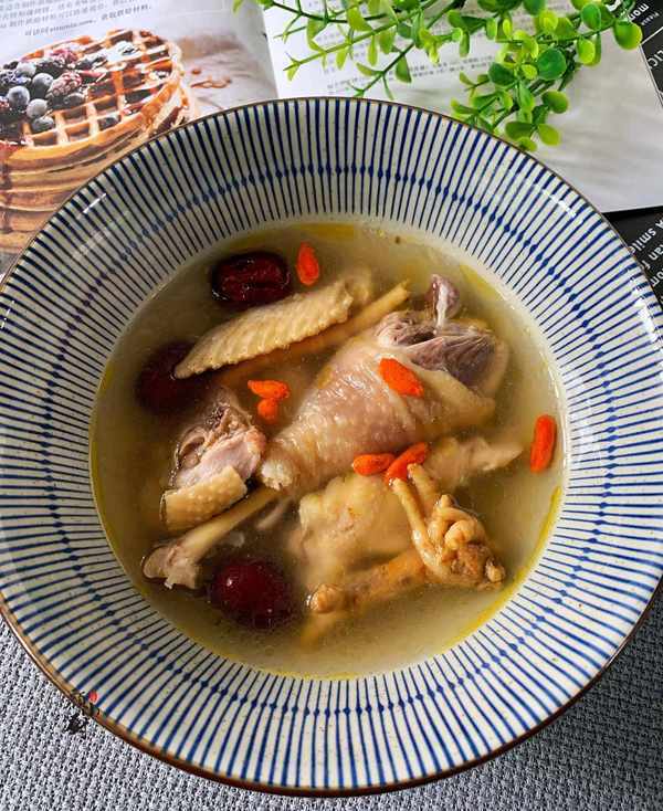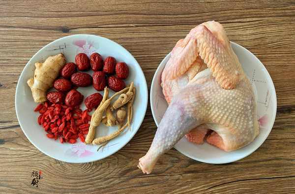 食材:土雞半隻,花旗參、紅棗、枸杞各適量,生薑一塊,食鹽一勺。