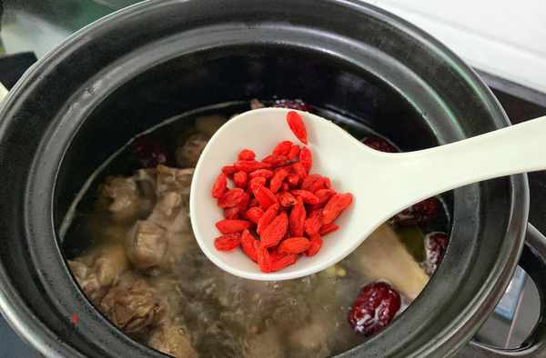 步驟七:40分鐘後,濃濃的雞湯味就飄出來瞭,放入枸杞,一勺食鹽調味,攪拌均勻就可以關火出鍋啦!