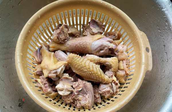 步驟四:用清水沖洗幹凈雞肉表面的浮沫,控幹水分。