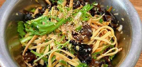 泡發後的木耳不建議直接吃,在開水中煮3到5分鐘後方可食用,取兩張豆腐皮同樣用開水煮2分鐘左右。豆類的食品含鈣量較高,中老年人吃也是非常有好處的,將豆腐皮切成絲和泡發好的木耳一起放到盆裡,加入適量的鹽,生抽、雞精、香油、蠔油、香菜、白芝麻,抓拌均勻裝入盤中即可食用。