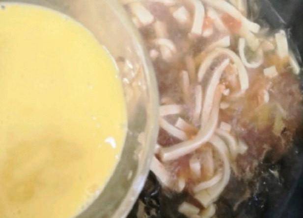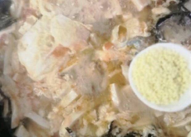 第四步:鍋中加入小半鍋清水,開大火燒開,然後加入豆腐丁,水開再打入一個雞蛋,雞蛋倒入後迅速攪拌,這樣做出來的湯會更加好看,且有食欲