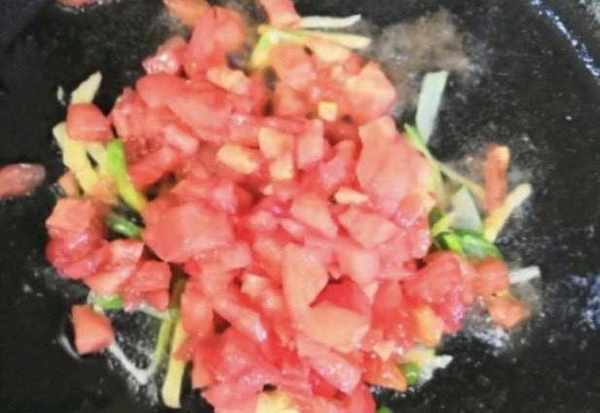第三步:起鍋燒油,放入薑末炒香,放入切好的西紅柿碎,翻炒均勻下入木耳再次翻炒