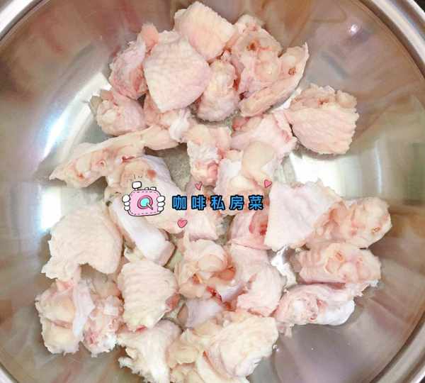 雞翅大的一分三,小的一分二,剁小塊更方便入味。在清水浸泡久一點充分泡出血水,瀝幹水分。