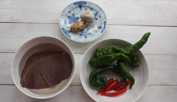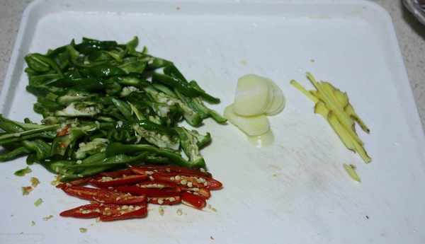 醃制豬肝的時間我們先處理一下辣椒,辣椒切絲,蒜頭切片,薑塊切絲。