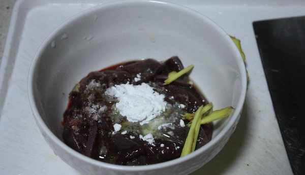 接著把豬肝切薄片,薑塊切成絲,加一勺生粉和1勺料酒以及少許鹽後拌勻醃制15分鐘。