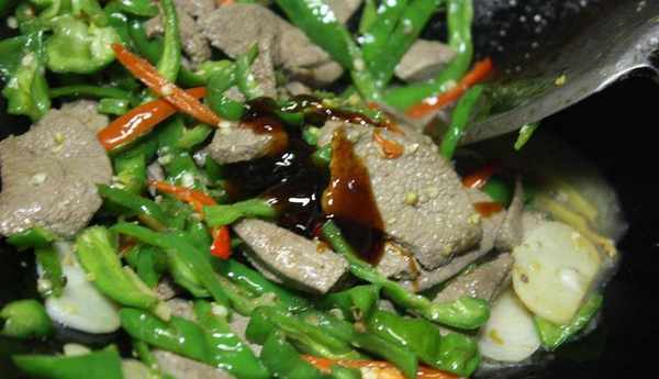 材料:豬肝250克,青紅辣椒適量,薑蒜少許